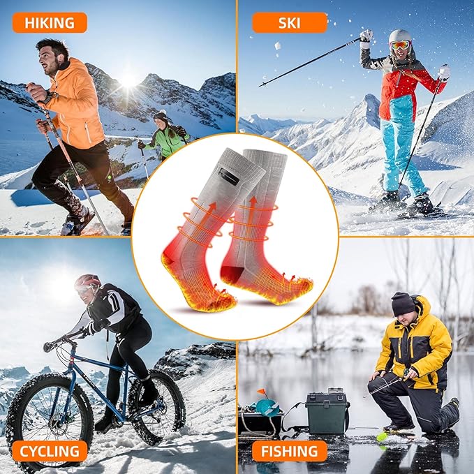 - 【Perfect for Sports Outdoors】Great for hunting, skiing, fishing, hiking, walking dogs, snowboarding, motorcycle, riding, and sporting events. Heated socks are given to your family and friends as ideal winter gifts, they will have a warm winter when participating in outdoor activities