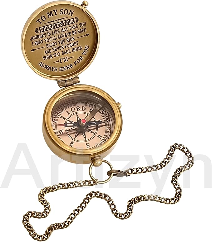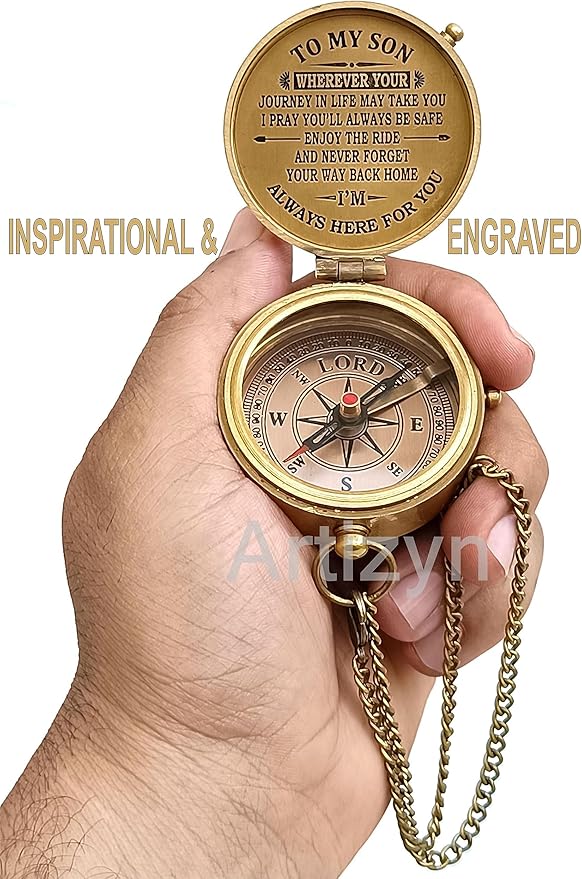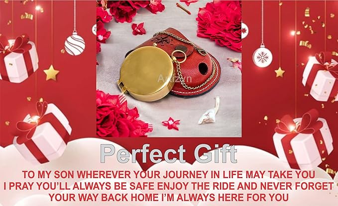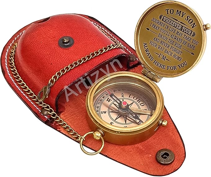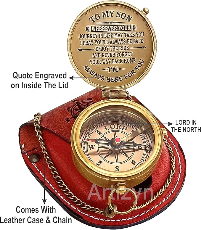 - Antique brass compass is corrosion resist, packed in a hand stitched Stamped Leather case with Engraved Quote "TO MY SON WHEREVER YOUR JOURNEY IN LIFE MAY TAKE YOU I PRAY YOU’LL ALWAYS BE SAFE ENJOY THE RIDE AND NEVER FORGET YOUR WAY BACK HOME I’M ALWAYS HERE FOR YOU” Under the tough glass cover is a beautiful, which will help you find and navigate your way to home.