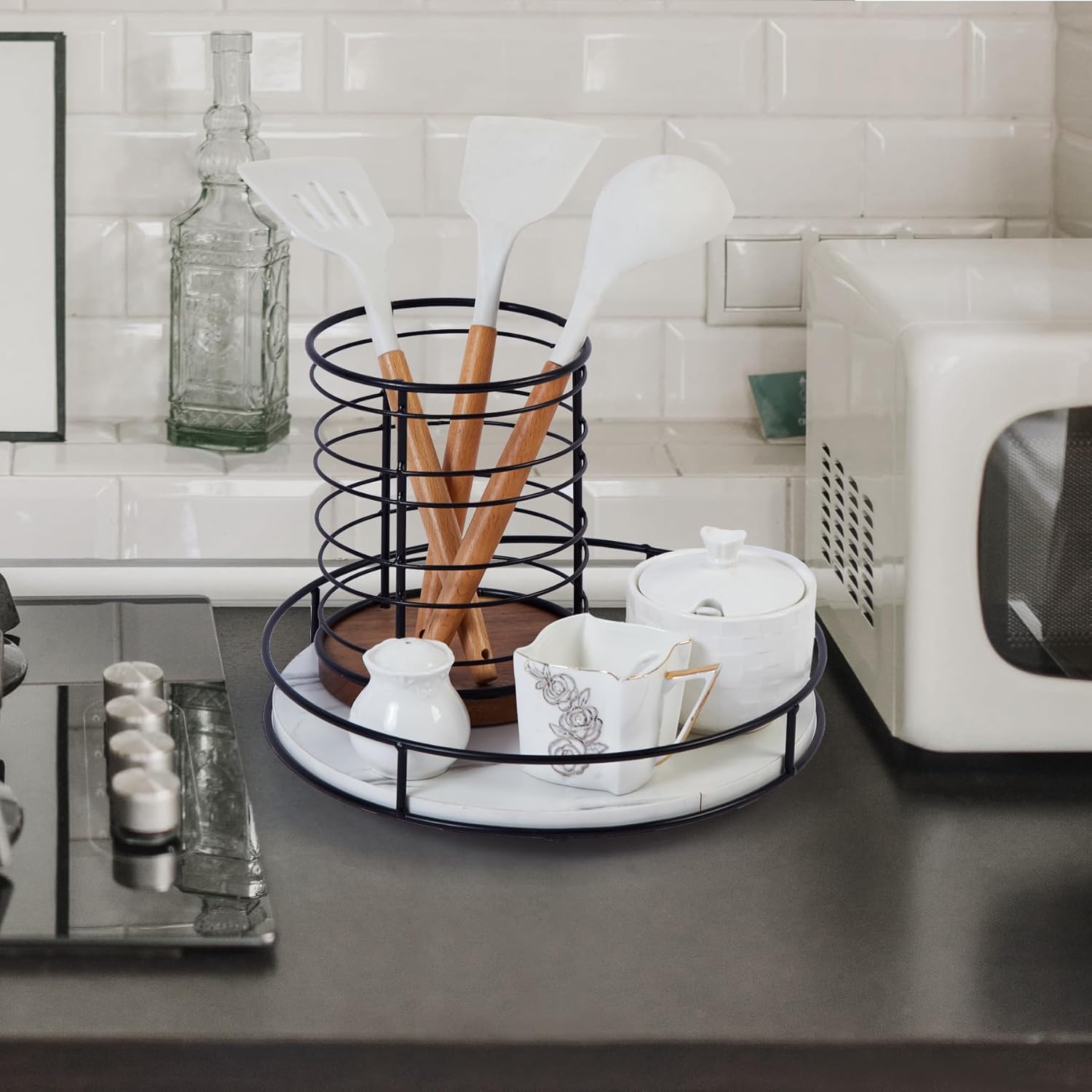 12 Inch White Wood Lazy Susan Turntable for Table, Kitchen Rustic Brown Turntable Organizer with Steel Frame, 360 Degree Decorative Turntable for Countertop Cabinet or Centerpieces