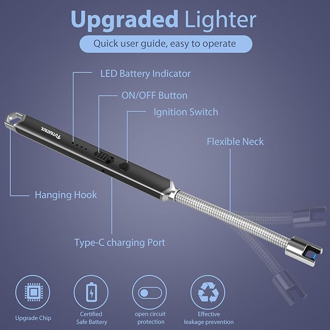 - Multiple Safety Design: Futratrix’s advanced technology and multi-protect safety system protect your safety. You need to slide out the safety lock first, then press the button to generate sparks. The spark will stop automatically after 7 seconds of ignition.The extended flexible neck helps us keep fingers further from the flame
