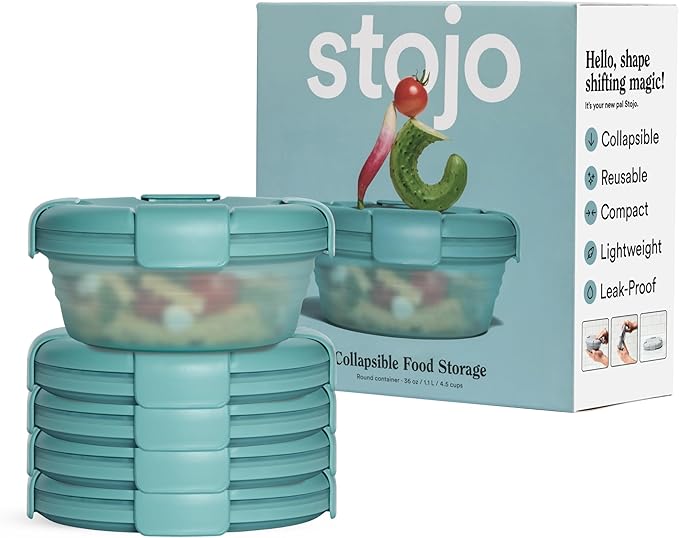- Collapsible bowl: It’s literally never been easier (or more fun) to prep, store, and take food on the go! This compact bowl collapses down to just 1.3 inches. The 36 oz Stojo Bowl holds up to 4.5 cups of eats and is made for the kitchen as much as the commute. It stores nested and flat to save space, then pops open to upgrade your meal prep, leftovers, and work lunches. This Aquamarine Blue container is going to look right at home in your kitchen cabinet.