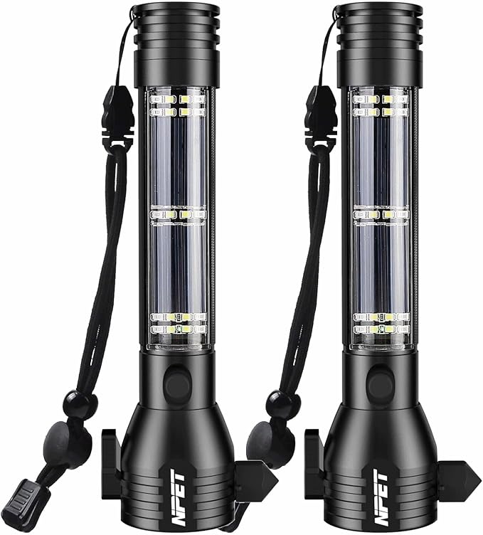 NPET T09 Solar Flashlight Car Flashlight 268 Lumens LED COB Light USB Rechargeable Tactical Multi-Function Torch Tool with Window Breaker Seat Belt Cutter Compass (T09-2pack)