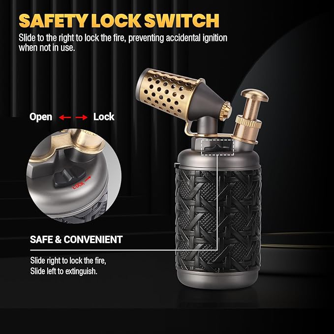 - 【Kitchen Cooking Butane Torch Lighter】This single jet flame kitchen torch lighter is made of zinc alloy and plastic, the lighter has a safety lock to prevent accidental ignition, high temperature resistant nozzles and ceramic insulation sleeves, safe and durable.