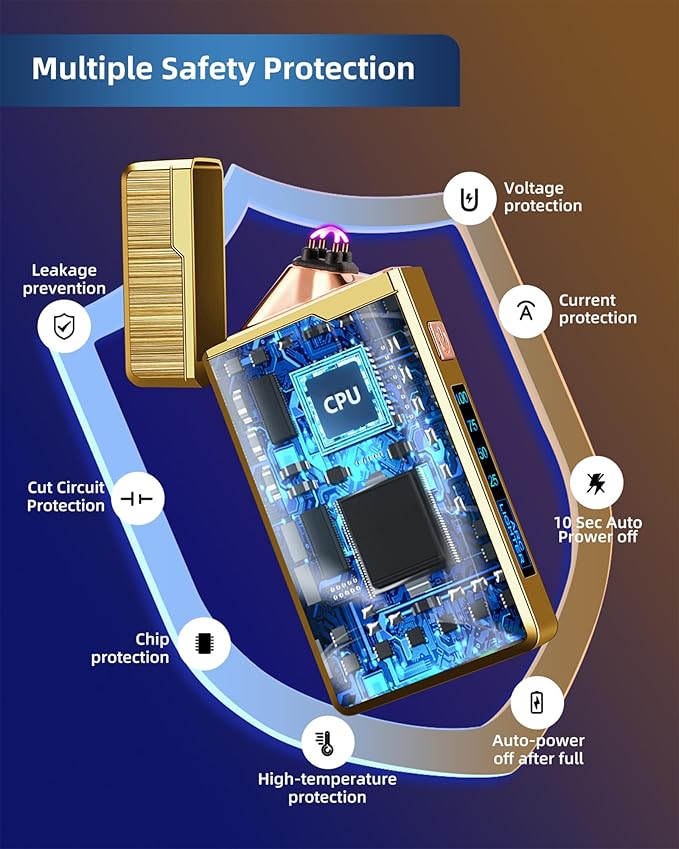 - SAFETY PROTECTION SYSTEM: The electric dual arc lighter will automatically turn off after about 10 seconds per use to protect the lighter from high temperature inside.