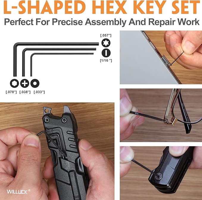 - L-Shaped Gadget: This distinct design combines a multi-tool with essential tools like L-key for Allen and hexalobular screws T5, L-key for cross plum blossoms and flathead screws 1.5, and SIM card ejection pin. As everyday carry items like phones, glasses, and watches gain popularity, people often need to fix minor issues on their own. This tool can be used to repair glasses, watches, compasses, and other items while engaging in outdoor activities like camping