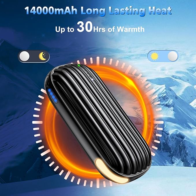 - 【Up to 30Hrs Wamth】 Rechargeable hand warmers 2 pack total is 14000mAh, they are designed with single/double-sided heating which can provide 6-15 hours warmth, 2 pack for 6-30 hours. Say goodbye to the hassle of frequent recharging and make sure you stay warm all day long!