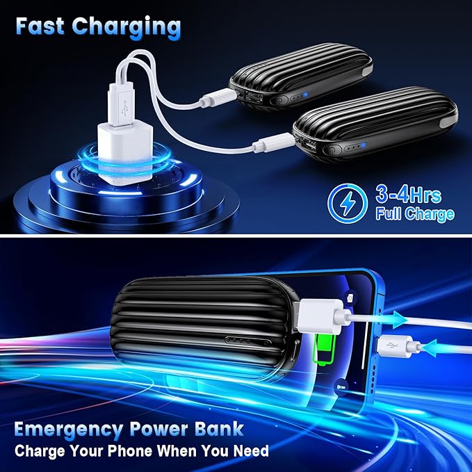 - 【Fast Heating & Mini Size】 Our hand warmers rechargeable 2 pack fast heat in 3 seconds perfect for cold freezing days! Say goodbye to cold fingers and long wait times. Rechargable hand warmers size is 1.14 in x 2.0 in x 3.97 in, only 0.31lb, perfect for golf, camping, hunting, fishing, watching a hockey game, hiking, walking the dog and other outdoor activities.