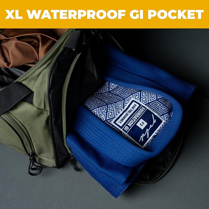 - XL Waterproof Gi Pocket: Keep your clean gear clean, and your sweaty gear separate. We enlarged the opening and capacity of our waterproof gi pocket, so you can stuff it full of shoes or dirty gear.