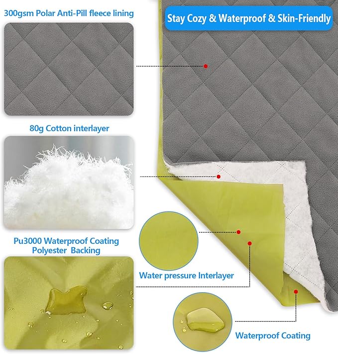 - STAY WARM & DRY in BAD WEATHER: The 300gsm fleece lining provides great comfort, combined with 80g of cotton in the middle layer, the warmth is further enhanced. Ultrasonic stitching keeps 2 warm fabrics tightly fitted, allowing you to wear a snug and non-bulky look. The backing layer is made of 210T, PU3000 fabric with a special coating and water-pressure material, which is highly waterproof and windproof. Easily removes stains with a shake and dries quickly. Multi-layer combinations make the blanket a great defense against unexpected weather changes.