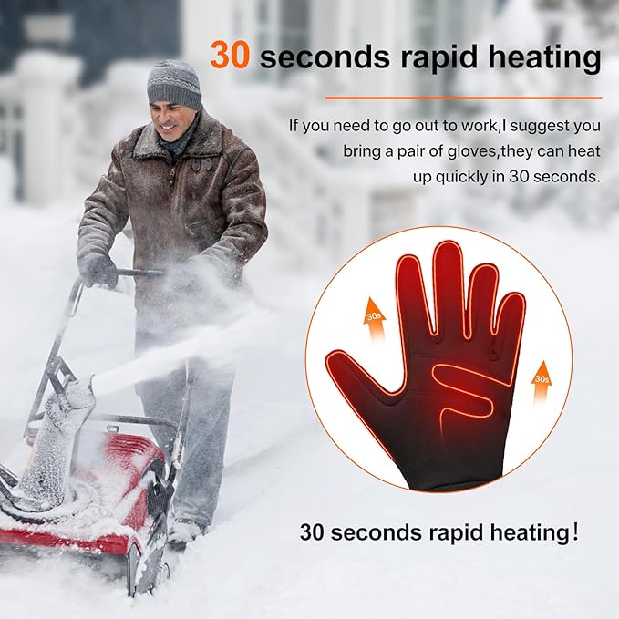 - 【30-Second Quick Heating】Our rechargeable glove liners, suitable for both men and women, heat up rapidly in just 30 seconds, offering unparalleled convenience and speed. These electric heated gloves, also ideal as heated motorcycle gloves, feature a touch-sensitive design on the thumb and forefinger, enabling effortless use of touchscreen devices even in cold winter weather. Say goodbye to the hassle of removing your gloves when operating devices like mobile phones and tablets.