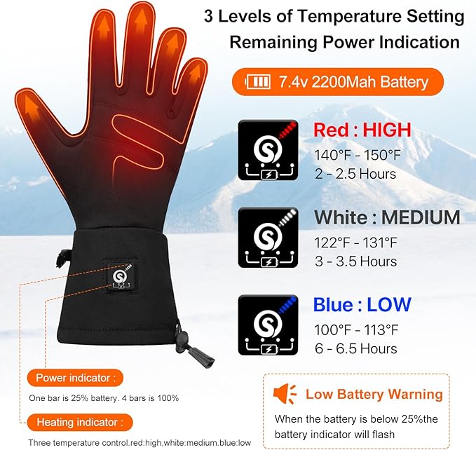 - 【Superior Warmth】Our battery heated gloves, suitable for both men and women, feature a 7.4V 2200mAh rechargeable Li-ion battery for extended usage, stability, and safety. These gloves can provide continuous warmth for 2.5-7 hours after a full 5-7 hour charge, making them perfect for those who need heated gloves for men and women on the go. With three adjustable temperature modes, they cater to your warmth needs in different weather conditions.