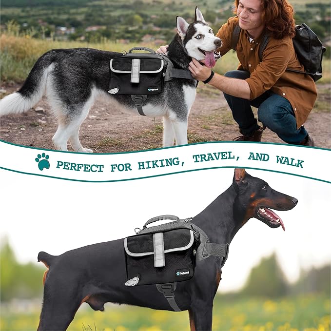 - DOG HIKING BACKPACK HARNESS: Dog vest with pockets is best for hiking and comes with D Ring for attaching a leash. This dog backpack for dogs to wear is also equipped with a reinforced sturdy grab handle. Dog saddle bag features multiple adjustable straps to make it super easy for strapping the pack comfortably on your dog. Mesh padding layer offers breathable comfort for your dog.