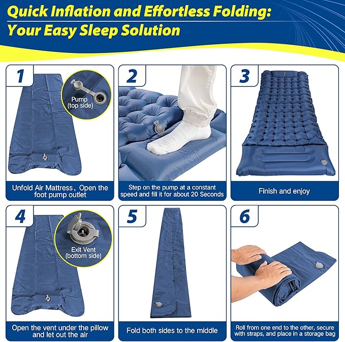 - STOMP TO INFLATE - FAST & CONVENIENT: Say farewell to hand pumping! Our integrated foot pump inflates your camping mattress in just 30 seconds, ensuring hygiene and rapid inflation. Anti-leakage films in the valves provide worry-free usage, making setup a breeze and ensuring you spend more time enjoying the outdoors and less on setup.