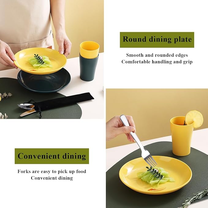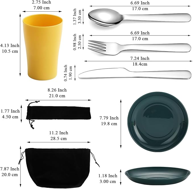 - GREAT VALUE SET: You will get a nice set of cutlery, the set includes 2 large plates, 2 large capacity cups and 2 sets of stainless steel cutlery, the cutlery includes knives, forks and spoons.