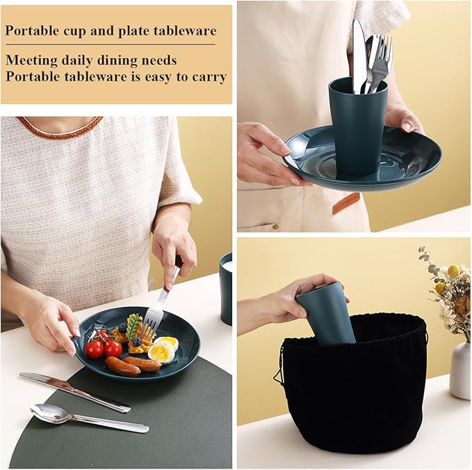 Camping Utensils Mess Kit, Including Camping Spoon, Fork, Knife, Plate and Cup Packed in a Portable Bag, Easy to Carry, Dishwasher Safe