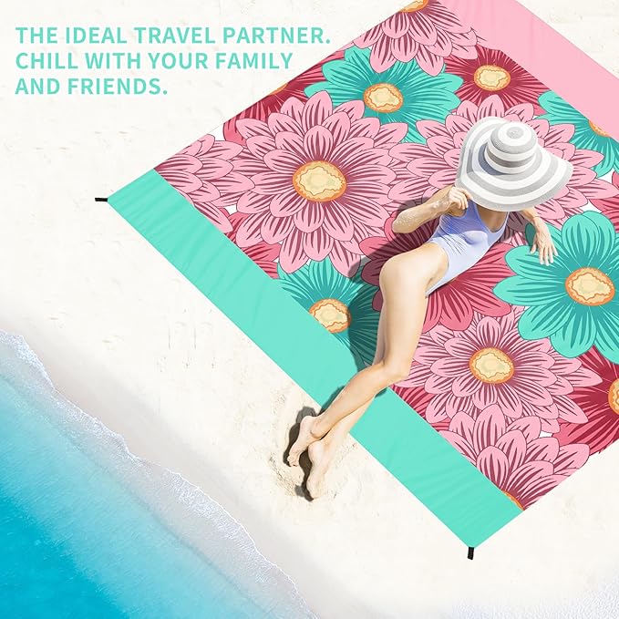 BYDOLL Beach Blanket Sandproof Waterproof 78''×81'' 1-4 Adults Floral Compact Lightweight Oversized Beach Blanket Large Picnic Mat Beach Blanket for Travel Camping Hiking Picnic