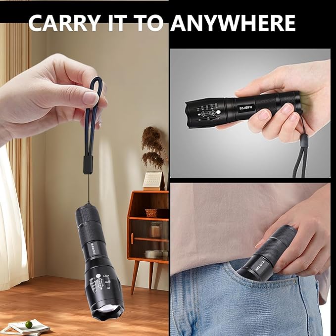 - 【SUPER BRIGHT FLASHLIGHT】Super strong T6 chip, stable performance, low power consumption, can provide uniform, continuous high brightness beam. led flashlight small body and equipped with a lanyard, easy to carry.