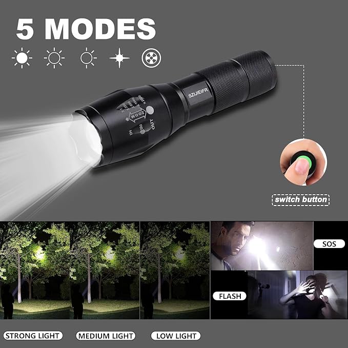 18650 Lightweight Flashlight Military Flashlight LED Pocket Flashlight Handheld Powerful Flashlight,5 Modes Zoomable, Aluminum Alloy,Waterproof for Home and Outdoor