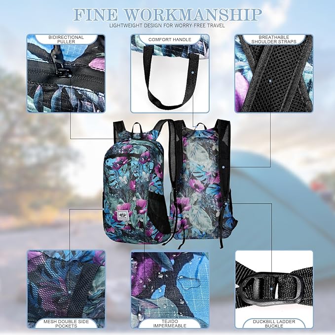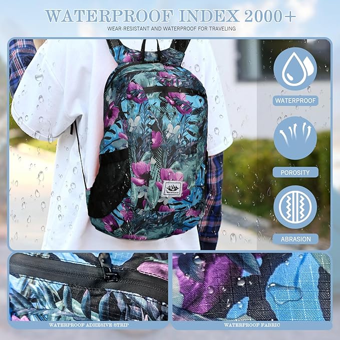 20L Waterproof Packable Hiking Backpack, Flower Ultra Lightweight Travel Camping Backpack for Women Men, Foldable Outdoor Day Pack Bag for Backpacking Sports (Color 1)