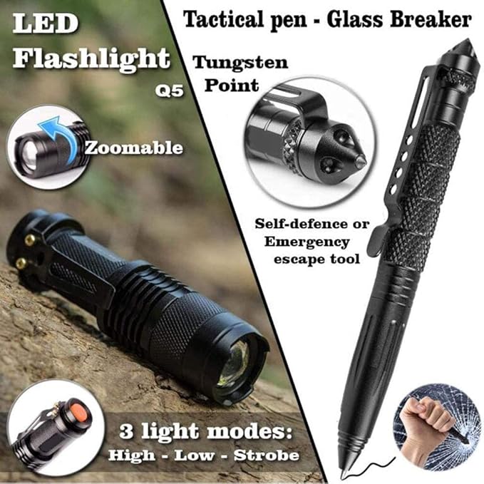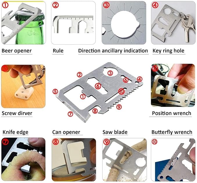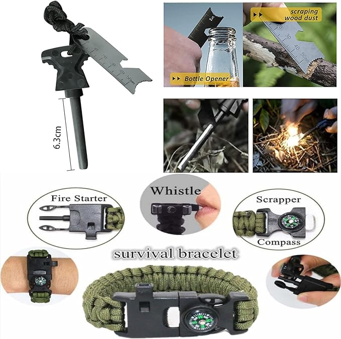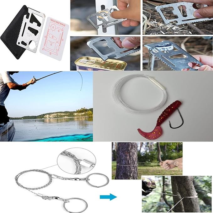 - Included Components : Waterproof Box Pocket bellow, Wire saw, Water Bottle Clip, Emergency Blanket, Flint stone Scraper, Flashlight, Multi-use Card, Multi-function Spoon Fork, Fishing line, Fishing bait, Fishing hook Waterproof Box Pocket bellow, Wire saw, Water Bottle Clip, Emergency Blanket, Flint stone Scraper, Flashlight, Multi-use Card, Multi-function Spoon Fork, Fishing line, Fishing… See more
