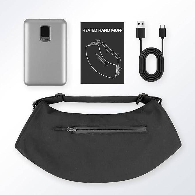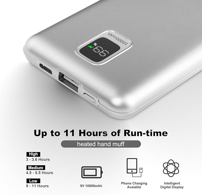 - 【Long-Lasting Heat】Say goodbye to constantly recharging your heated hand muff. Equipped with a 10000mAh rechargeable battery and a smart digital display for remaining power, this hand warmer pouch provides up to 14.5 hours of continuous heating. Plus, it can double as an emergency charger for your phone, keeping you connected.