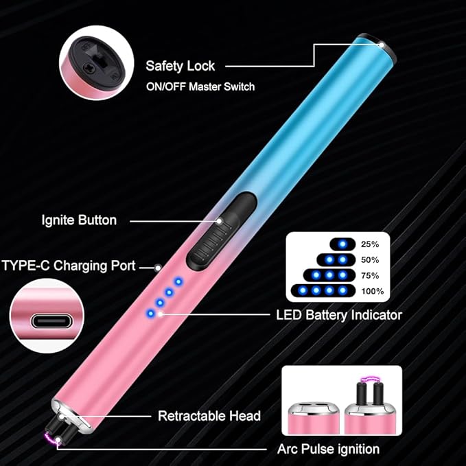 - ✨Enhanced Safety Features: Designed with child safety in mind, here's how it works: Step one-Turn on the master power switch located at the bottom of the usb lighter. Step two-Push the ignition switch upward to create the spark.