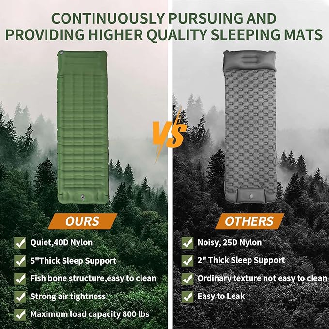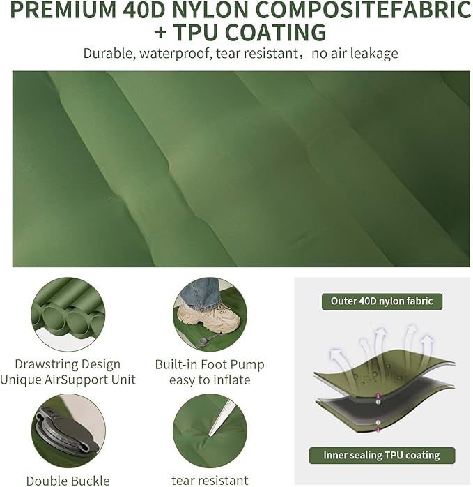 - TOP COMFORTABLE AND DURABLE: Our sleeping pad is made of ultra-tough 40D nylon coated with water-resistant TPU, durable and tear-resistant. This camping pad also features unique drawstring support technology. The air support units independently deform to conform to your body's curves and distribute gravity, and can hold up to 800 pounds of pressure when fully inflated. This camping air mattress Comes with 2 emergency patches and heat sealed edges to solve the problem of air leakage and tears