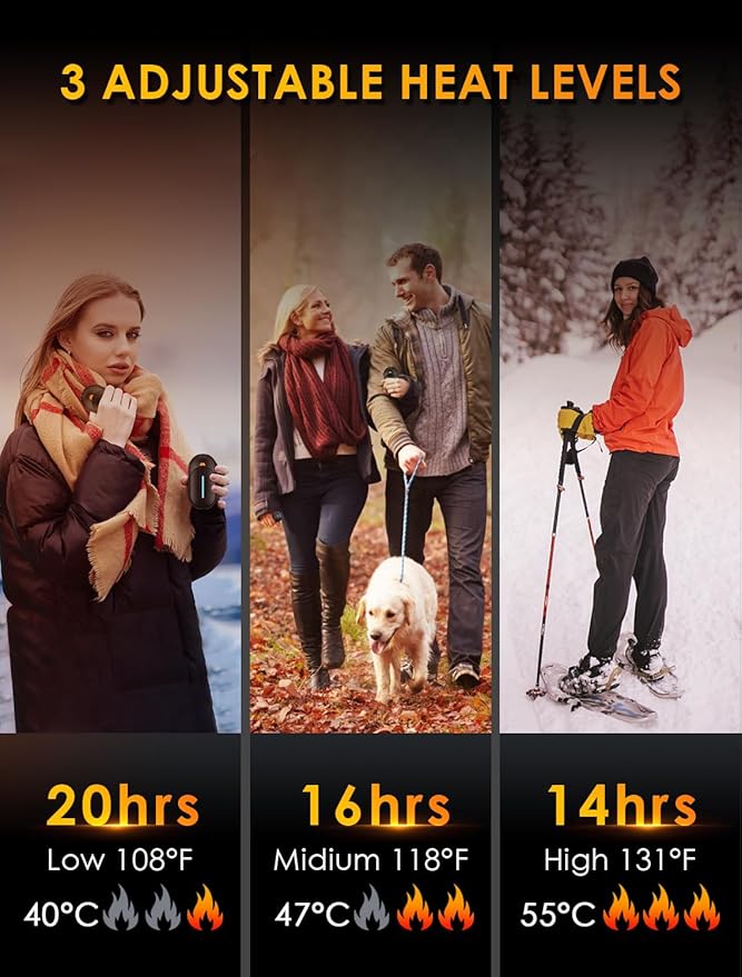 - FAST HEATING & 3 LEVELS- For stable and safe heating, We only use premium chipset to control the heat levels. With a 20% increase in power density, in only 2 seconds, our reusable hand warmer can quickly heat up to 95°F. 3 levels of temperatures 95-107°F/104-118°F/118-131°F at your choice.