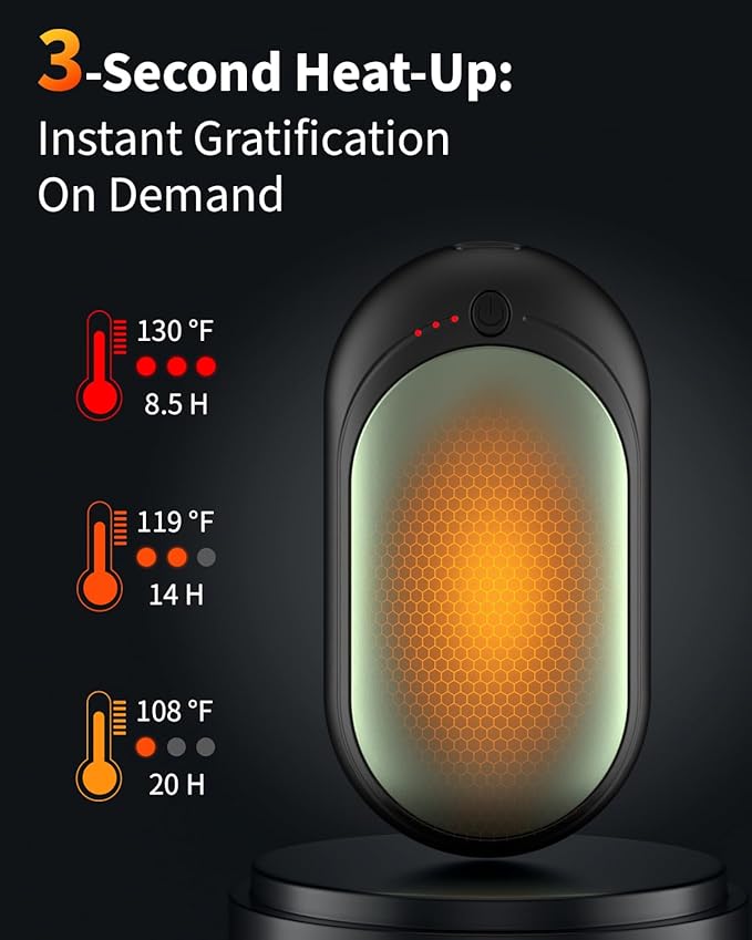 - Efficient Hand Warmer: Two-in-one design, you can share warmth with your loved ones. The 2023 upgraded portable handwarmers employ cutting-edge heating technology to generate consistent and soothing warmth in seconds. With 3 heat settings,