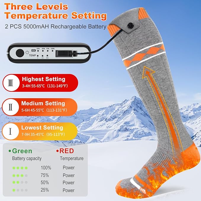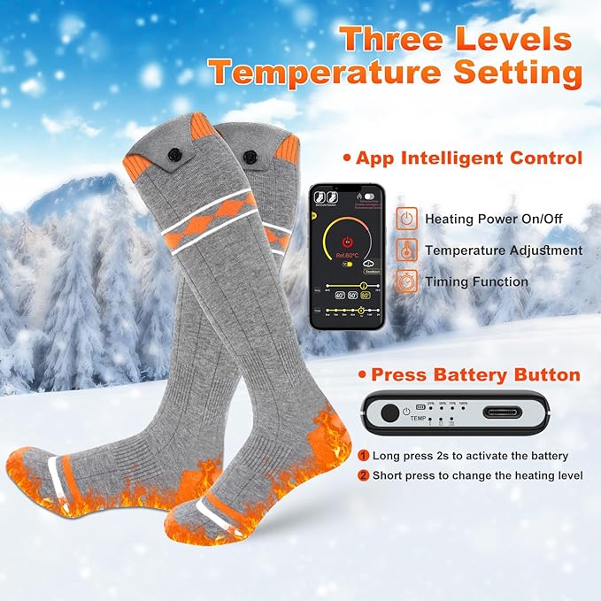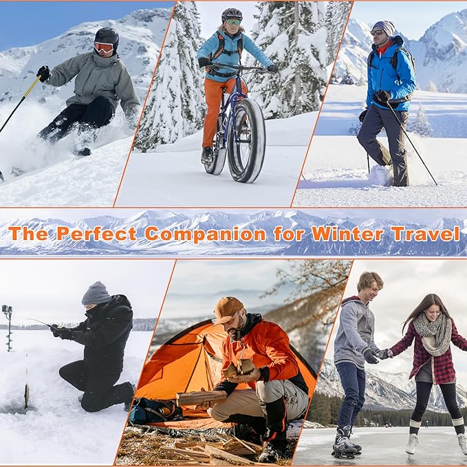 - 🔥PERFECT COMPAION🔥: No matter the winter adventure, our heated socks are your reliable companion. Whether you're skiing down the slopes, ice skating with friends, fishing by the frozen lake, camping in the wilderness, hiking scenic trails, or cycling through snowy landscapes, these socks will keep your feet warm and protected throughout. Pair them with any winter shoes for complete comfort and peace of mind.