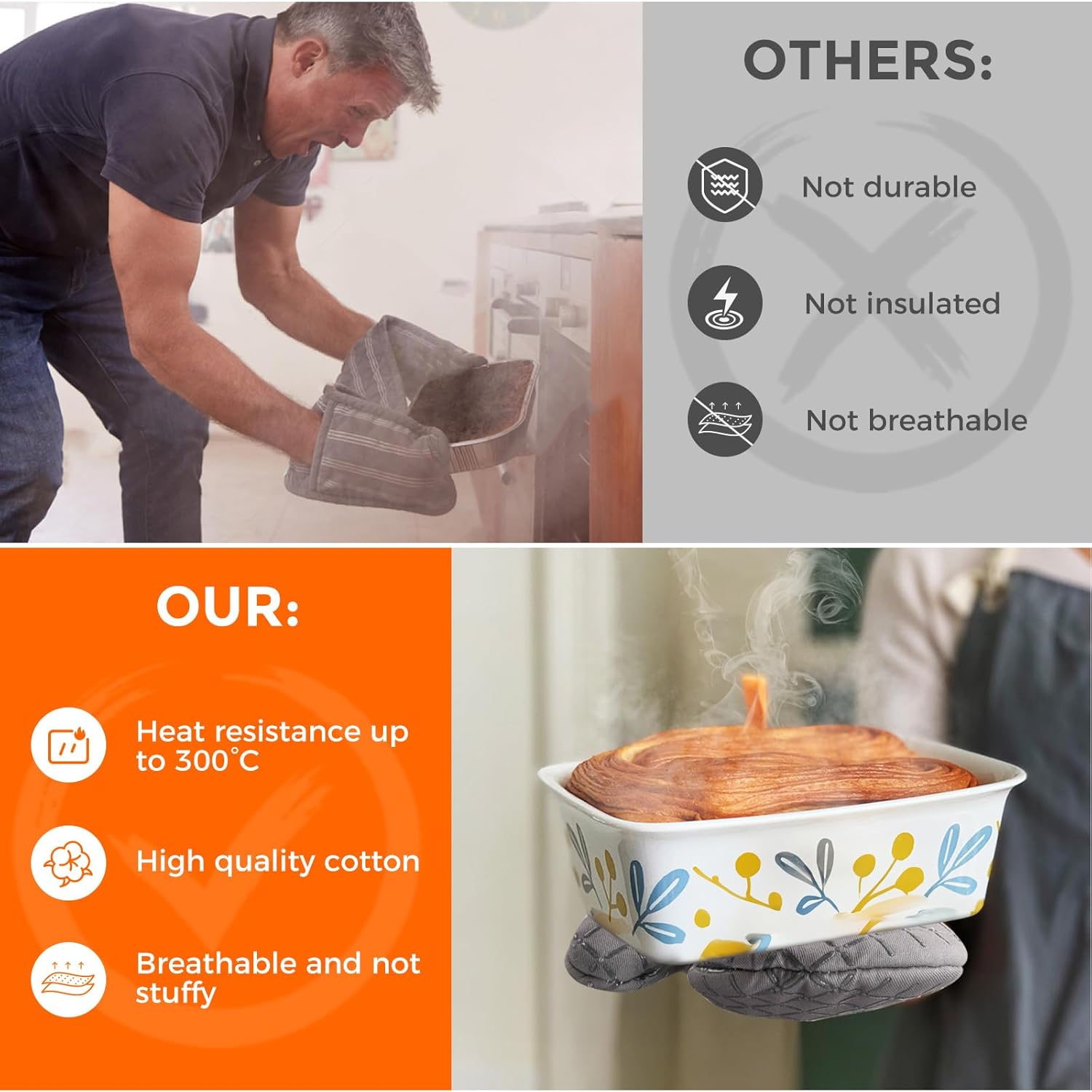 - 【Heat Resistant Up to 500 °F】Our high-quality oven mitts and pot holder set is heat-resistant up to 500 °F. Whether you're taking a casserole dish out of your oven, taking a pan out of your oven, or taking care of your hot grill, you can be sure that your hands are reliably protected from burns by our oven mitts.
