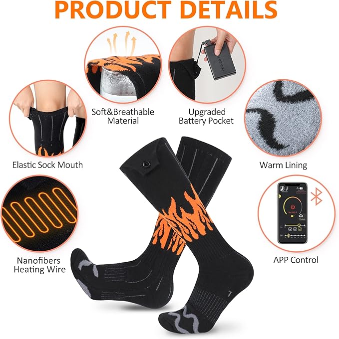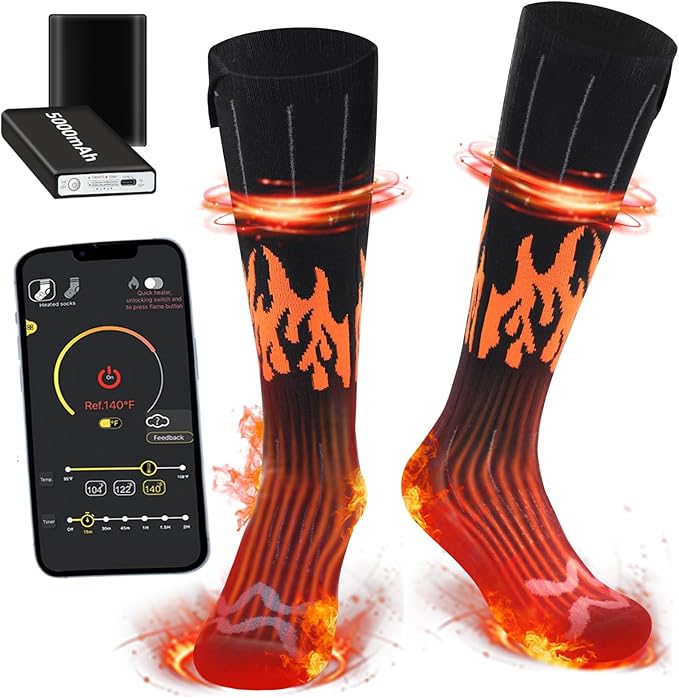 - 🔥【APP Control】Heated socks can be controlled not only by buttons,but also by mobile APP. The temperature can be monitored and adjusted anytime and anywhere, and the shutdown time can also be set.3 modes: low-temperature mode (40⁰C/104⁰F), medium-temperature mode (50⁰C/122⁰F), or high-temperature mode (60⁰C/140⁰F).
