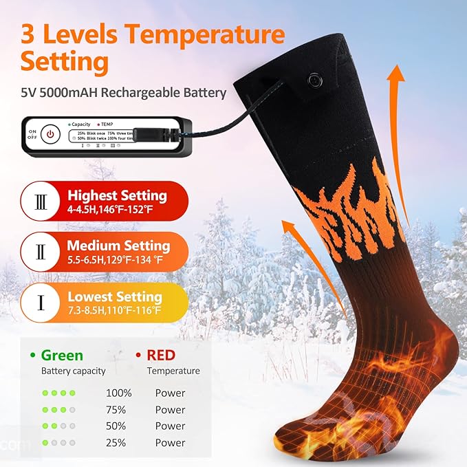 - 🔥【Speedy Heated】Rechargeable Battery heated socks used 5V 5000mAh rechargeable battery .the heating time will longer than 3.7V heated socks and these electric heated socks can warm your feet in less than 30 seconds. Also it is with 3 heat setting smart controller for you adjust the temperature easily.