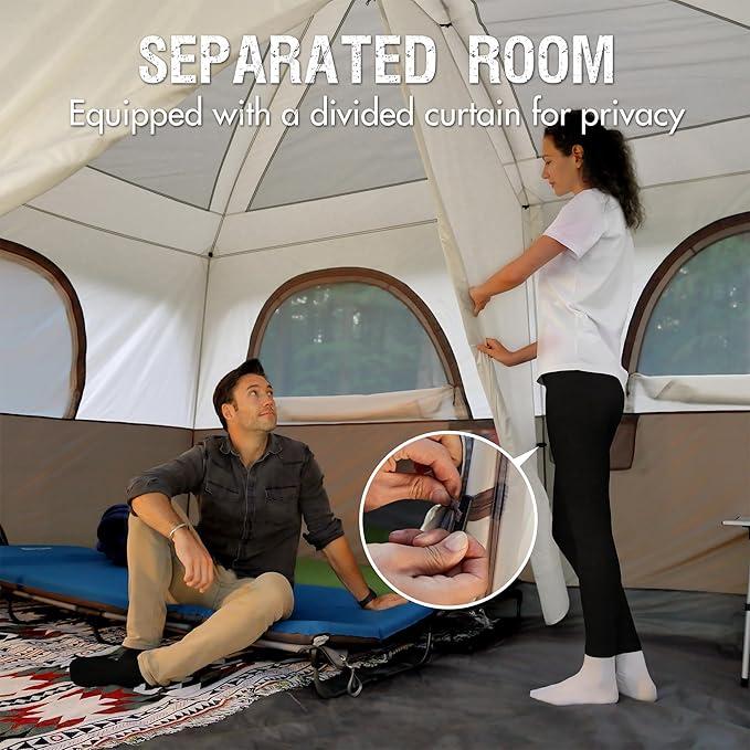 - 2 Room & Divider Curtain: A partition curtain can be hung from the ceiling of the tent to divide the large tent into 2 rooms with separate doors for increased privacy.