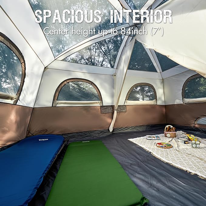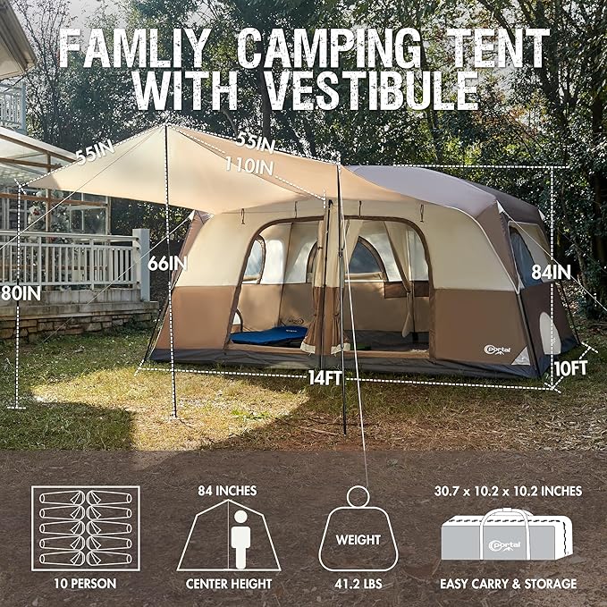 - Roomy for 10 Person: This camping tent is 14' x 10' x 84", spacious to fit 4 queen size air mattresses or 10 sleeping bags. The 84" center height is higher enough for standing up straight and comfortable movement inside the tent.