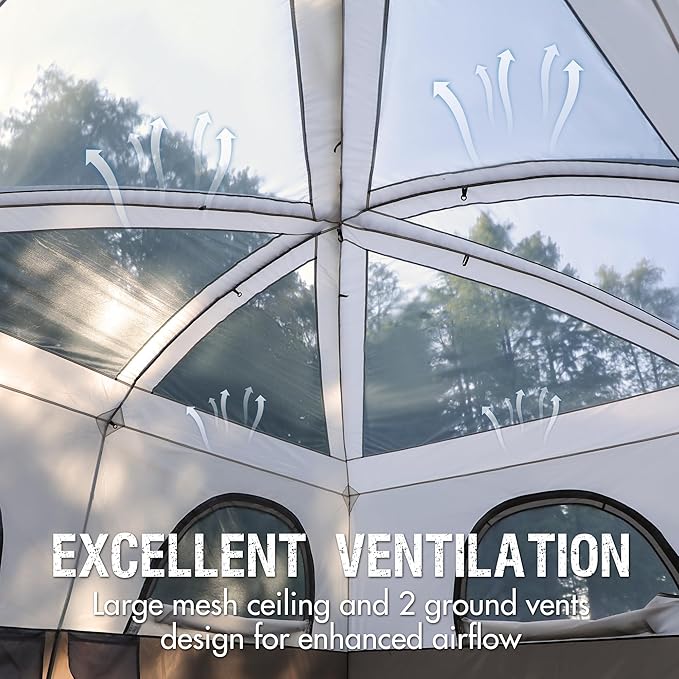- Good Vlentilation & View: To enhance airflow, this big tent has 2 large doors, 6 mesh windows, 2 ground vents, and 1 mesh ceiling that allow fresh air and a warm breeze to flow in and out quickly. Moreover, you are also able to enjoy a wide view of the stars while lying in bed with your family at night.