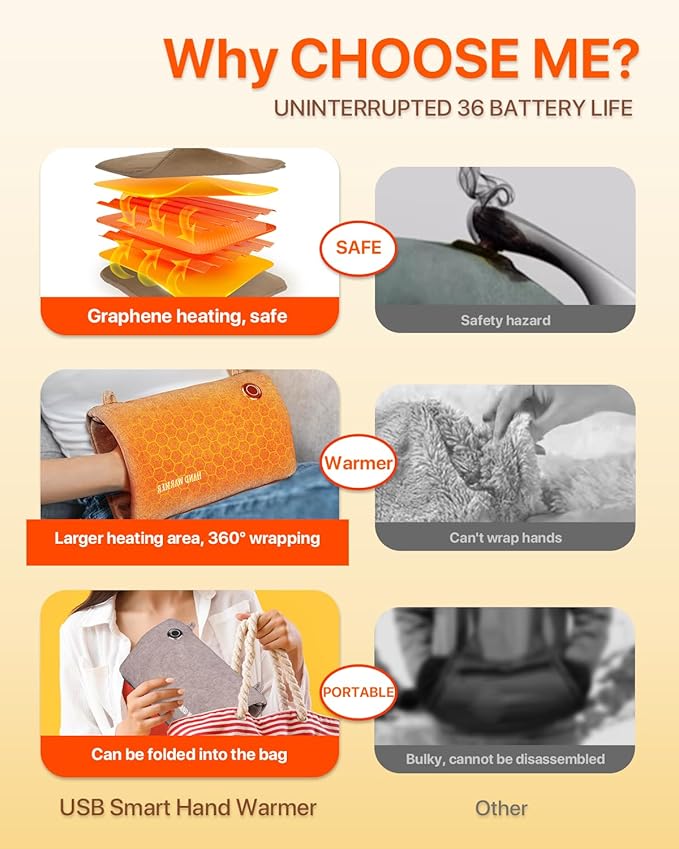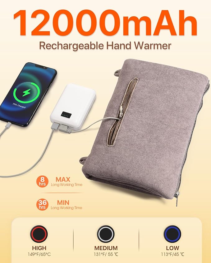 - 🔋【12000mAh Long Working Time】Electric heating pad with 12000mAh dual USB portable charger continuously warms your hands for 8-36 hours. It can also be used as a backup battery to charge your USB electronic device at same time.