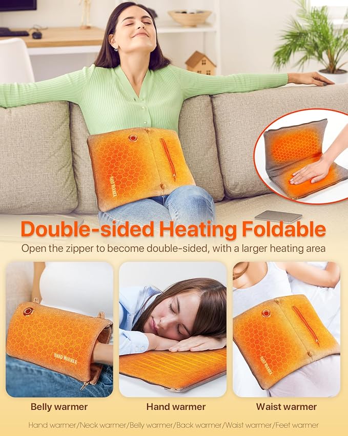 - 🔥【Double-sided Heating Foldable Pain Relief】Open the zipper of the hand warmers gloves and it becomes an oversized double-sided electric heating pad. Heating pad can deliver heat that penetrates deep into the affected area, and help relieve back pain, period cramps, neck/shoulder pain, arthritis, joint aches, and aches due to age.