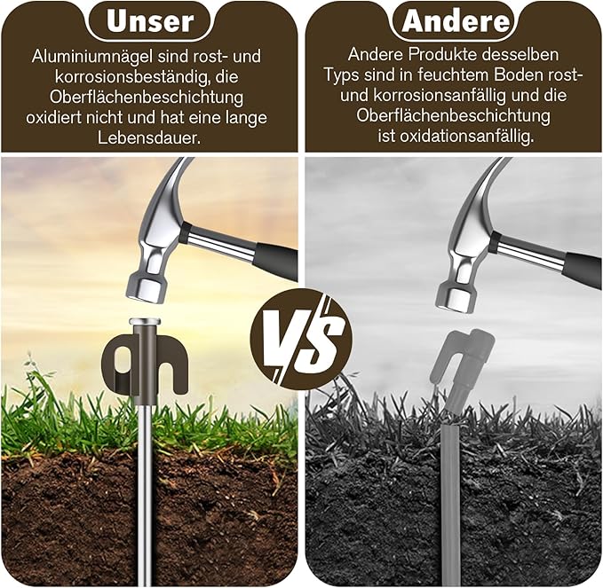 - STURDY TENT PINS: The sturdy aluminum tent pegs offer excellent rust and corrosion resistance and are durable enough to not only penetrate hard, compacted dirt and clay, but also pierce rocks without bending.
