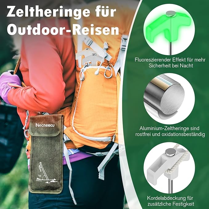 - 1 SET TENT Stakes INCLUDES: 1 set of 14 outdoor tent stakes, 1 tent stake storage bag, tent stakes are 20 cm long, 0.6 ounces per piece, easy to carry. Everyone: Tent stakes feature reflective thermoplastic T-tops with glow-in-the-dark feature that makes your tent visible at night, while the glow-in-the-dark feature also improves visibility and safety.