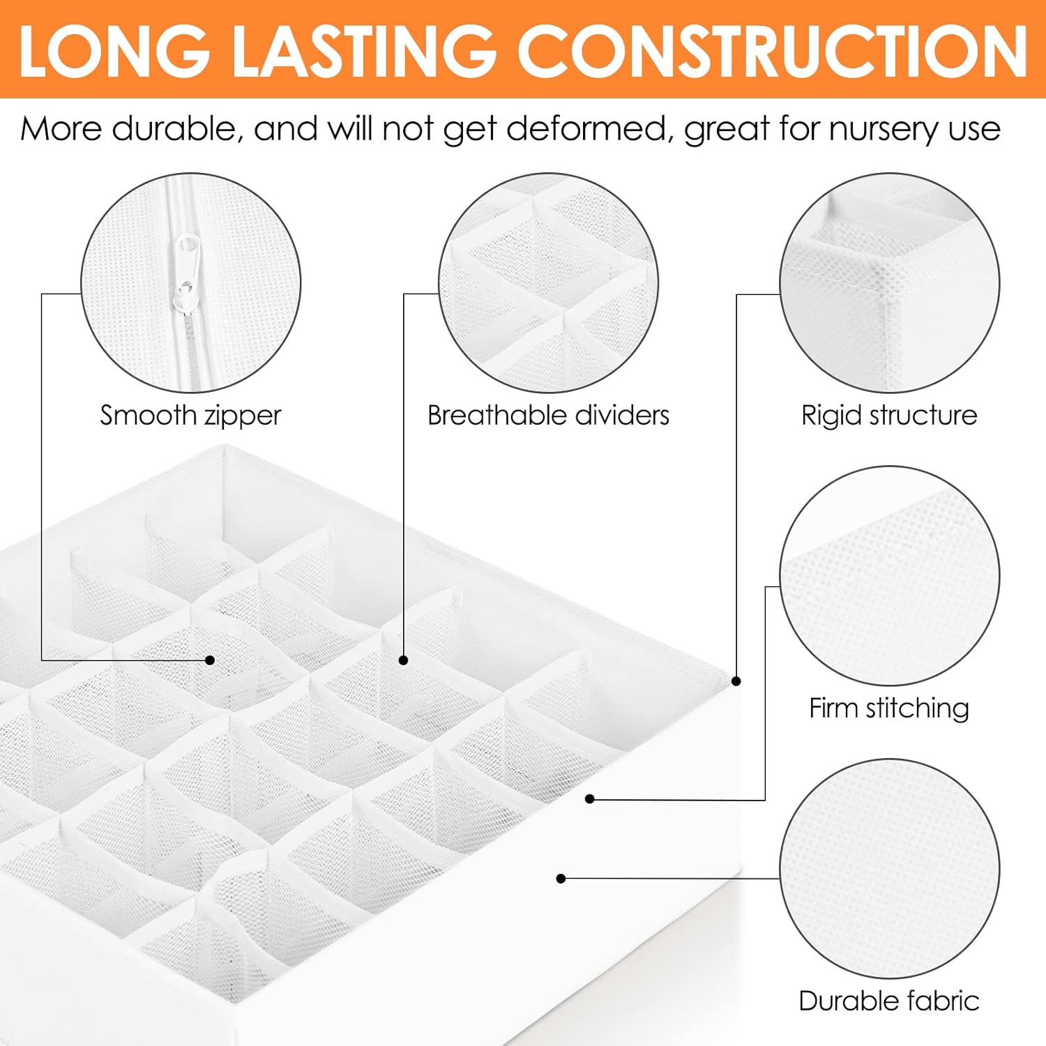 - 【FIT ALL DRAWERS】Measuring 4" high, these dresser drawer organizers will perfectly fit with most of dresser drawers, sock underwear drawer. Totally 12 organizer bins, 2pcs 6-cell as shirt or bra organizer (up to C cup), 2pcs 24-cell as sock organizer, 4pcs 8-cell as tie underwear organizer, 4pcs 6-cell as scarf, belt, baby clothes drawer organizer.