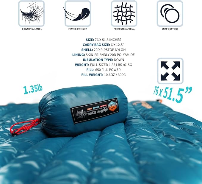 ZOOOBELIVES Ultralight Down Camping Blanket - 1.35lbs, 650 Fill Power Puffy Quilt. Compact & Warm Comforter for Travel, Beach, Hammock, Backpacking - Elevate Your Outdoor Comfort - AlpliveR300