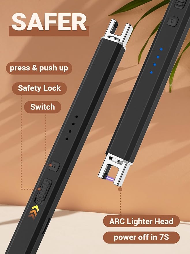 - [Easy to Use & Easy to Carry] The humanized non-slip safety switch design ensures your family's safety compared to other styles on the market. PUSH UP safety lock & PRESS switch then arc lighters working right away. Pocket-sized, thin and light body for portable, rechargeable candle lighter is an elegant super-handy tool for your daily indoor & outdoor use. Very perfect for home, office, bedroom, bathroom, kitchen, grill, fireplace, fireworks, party, spa, traveling, cooking, camping, hiking, BBQ