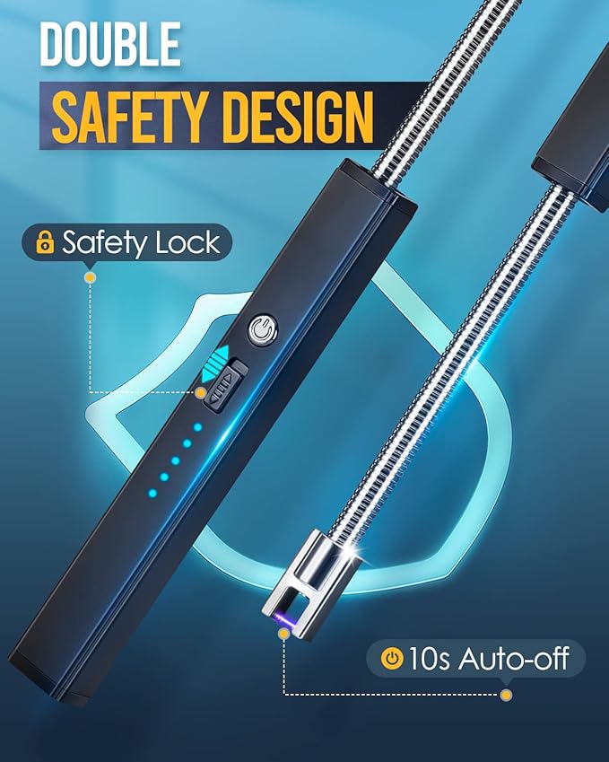 - PROTECTION SAFETY DESIGN:Our lighter had passed the CE, RoHS, and UL tests. Designed with safety in mind,The flexible neck can be rotated in any direction or configuration, keeping your fingers safe, and can be used in even candles of any shape and depth. When ready to light, just push the safety lock to the downside and press the activation non-slip design switch button. Very safe for families with curious kids. After each ignition for more than 10 seconds, the spark will automatically stop.