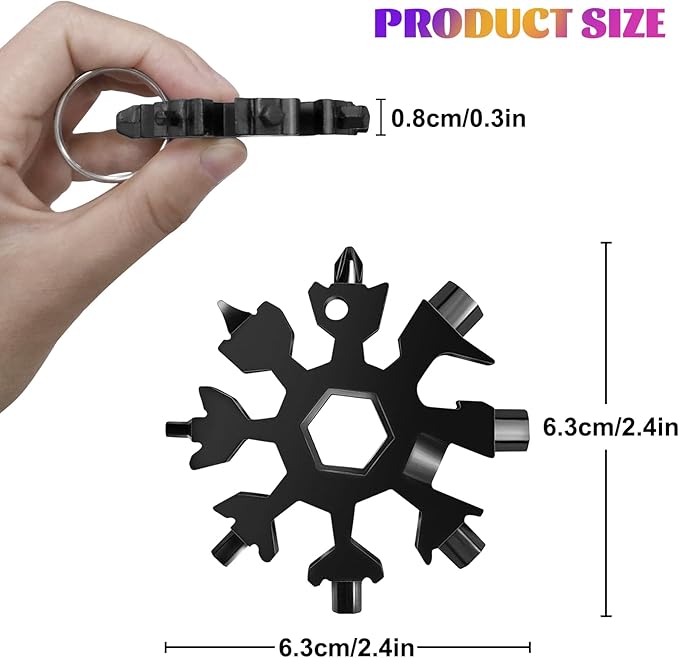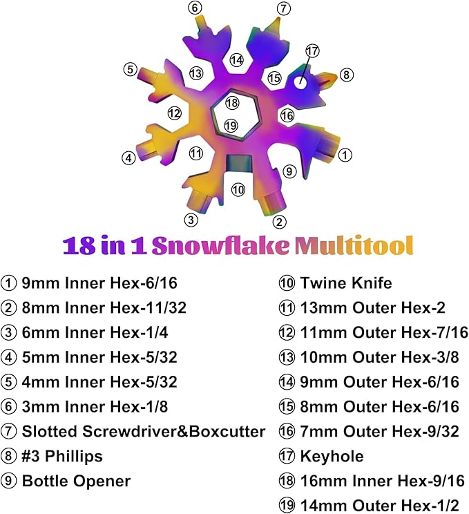 - 【18-in-1 Multi-Tool】Our package contains 9pcs 18-in-1 snowflake multitools, slotted screwdriver/box opener, bottle opener, rope cutter, keyhole, Phillips screwdriver 3mm, Allen wrench: 3, 4, 5, 6, 8, 9, 16 mm; Outer hex wrench: 7, 8, 9, 10, 11, 13, 14 mm.