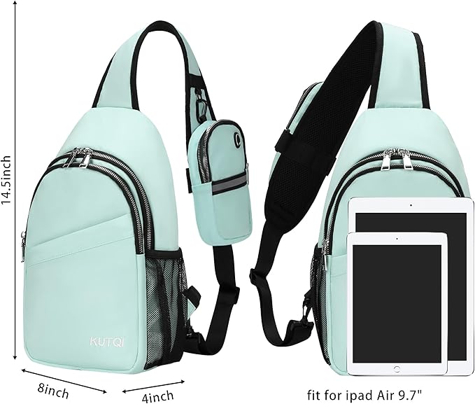 - Keep Everything Organized: Dimensions:14.5x8x4 inches / 37x20x10 cm.The sling bag contains 6 main pockets, a front pocket,two side pockets and a back pocket.The main pocket can put iPad,books,power bank,etc.Side pockets hold water glasses and umbrella.There are also multiple small pockets for your passport, cards, pens and more.Allows you to arrange your items in an orderly manner, making travel more convenient.