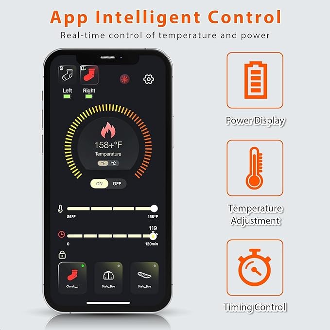 - APP Intelligent Control: MATKAO heated socks come with an exclusive APP. You can scan the QR code in the instruction manual or search for Q-thermo in the app store to download the app, which can accurately adjust the temperature, timing function and real-time power display. The temperature can be adjusted to any comfortable temperature from 86°F to 158°F; no need to bend over to find the switch in winter, allowing you to better enjoy the warmth brought by the heated socks