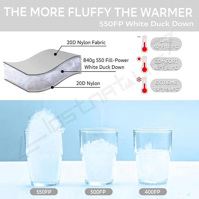 - PREMIUM DOWN INSULATION: Clostnature down sleeping bag using a full 840g 100% 550 fill-power white duck down. This pure, odorless down filling ensures excellent insulation without any impurities, providing a comfortable experience akin to floating on clouds. Before using an ultralight sleeping bag, you can gently tap it, which will make the inside more fluffy and provide you with a better experience. Recommended use temperature: 15F/(-9.4°C)-52F(11.1°C), comfortable temperature is 43F(6.1°C)