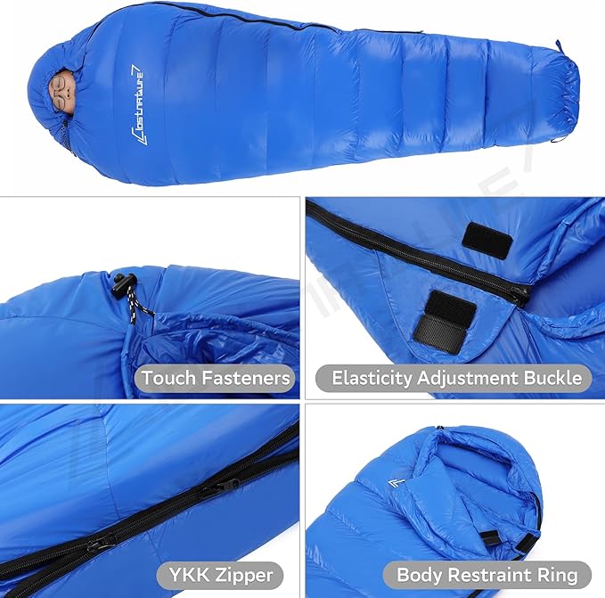 - ROBUST AND WATERPROOF: The down sleeping bags are crafted with 20D insulated nylon fabric, designed for enduringness and softness. Additionally, we employ advanced DWR waterproof coating for enhanced protection. It can provide a cozy sleeping environment while withstanding the demands of extreme outdoor weather conditions, ensuring it withstands the rigors of outdoor use for years to come. NOTE: Despite our various waterproof designs, down-filled products are not recommended for machine washing