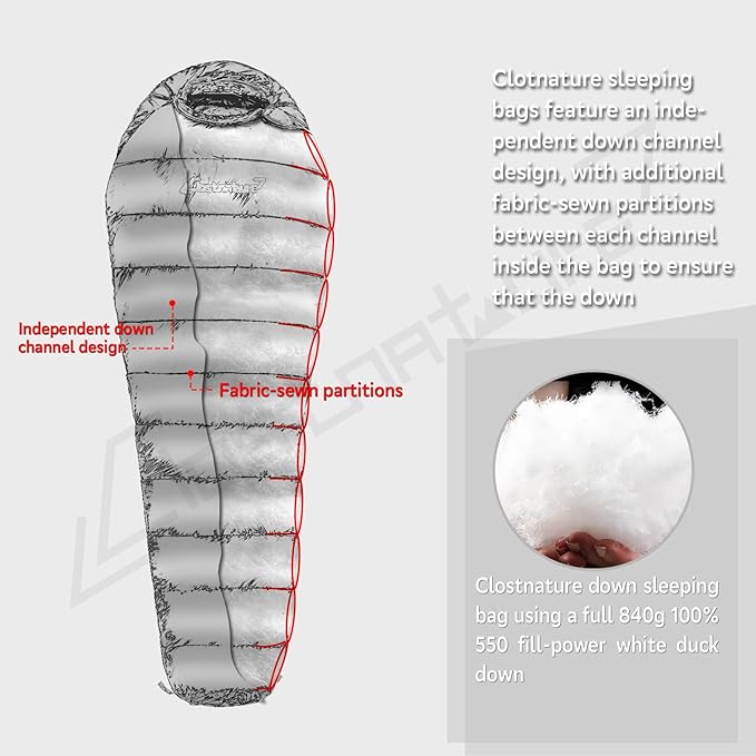 - CRAFTSMANSHIP: Clotnature 3-4 season sleeping bags feature an independent down channel design, with additional fabric-sewn partitions between each channel inside the bag to ensure that the down remains evenly distributed and doesn't shift around. The internally sewn small pocket can be used to store a phone